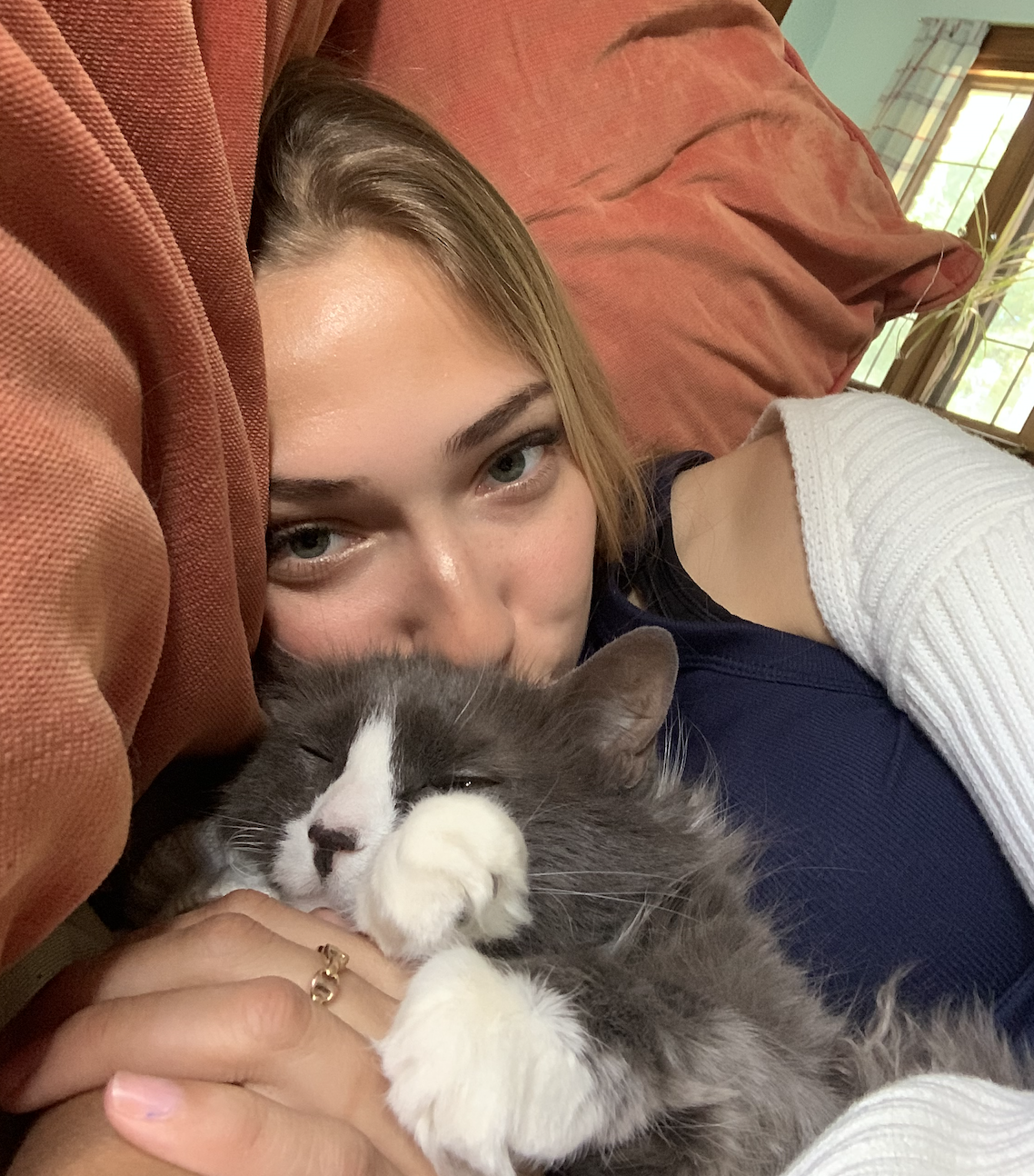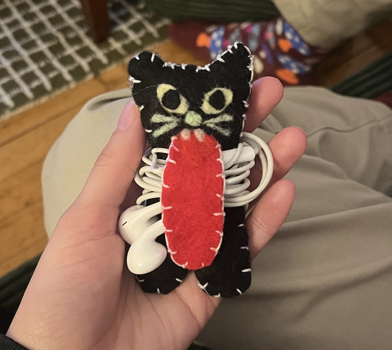 In my free time I enjoy staying home with my cats, reading, doing felt crafts and listening to podcasts.